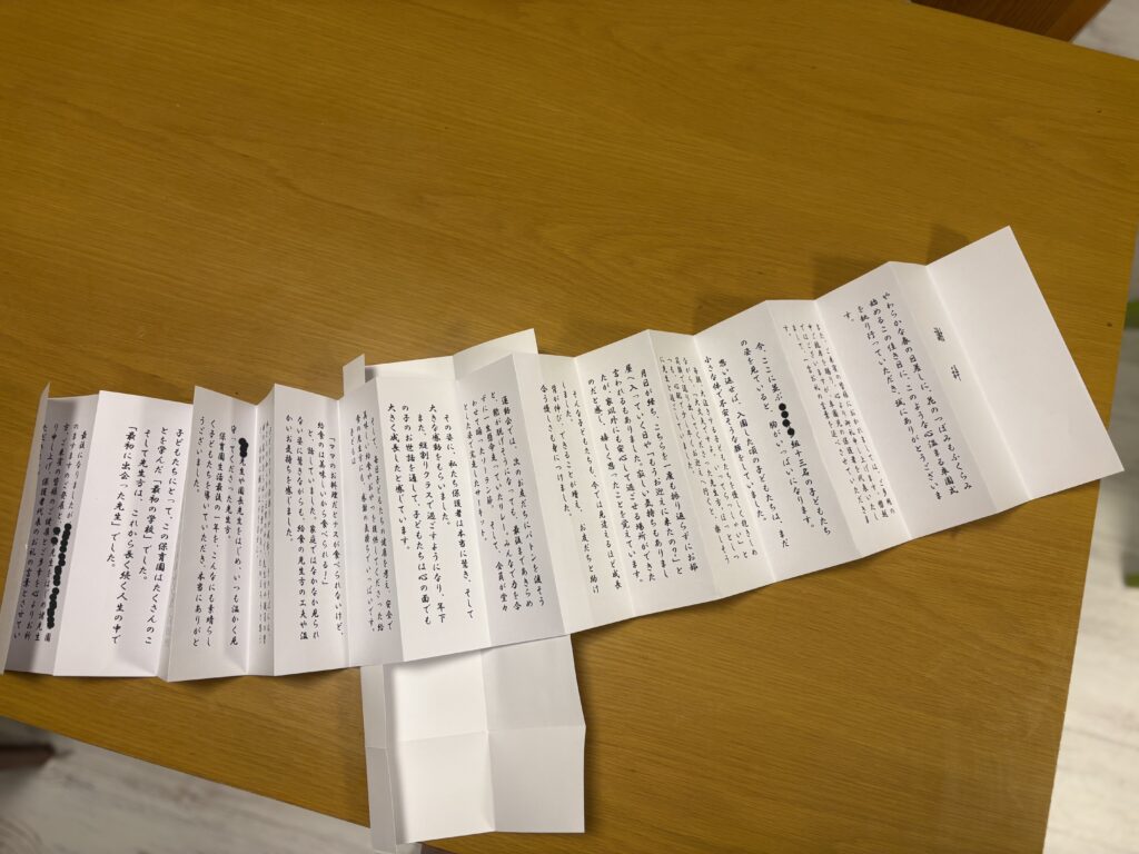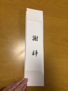 ▼じゃばらに折りたたんだ式辞用紙を包むのが多当紙です。これはA4よりもサイズが大きく、家庭用プリンターで印刷できなかったため、普通のコピー用紙に「謝辞」と印刷してカットし、多当紙に貼り付けました。